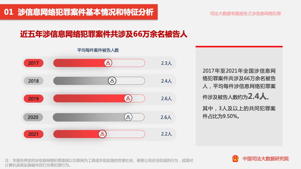 五年來(lái),全國涉信息網(wǎng)絡(luò )犯罪案件共涉及66萬(wàn)余名被告人,平均每件案件涉及被告人數約為2.4人。其中,3人及以上的共同犯罪案件占比為9.50%。