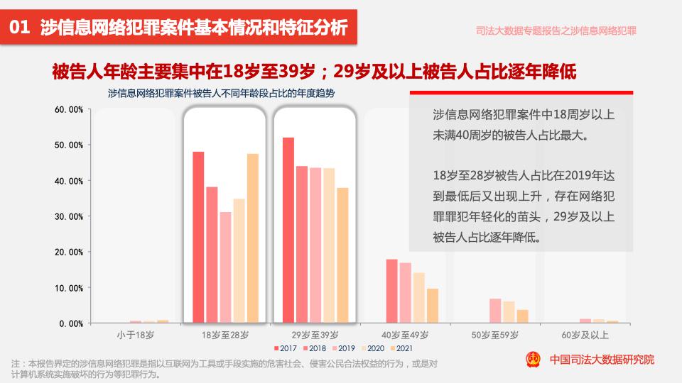 報告顯示,在涉信息網(wǎng)絡(luò )犯罪案件中,18周歲以上未滿(mǎn)40周歲的被告人占比最大。18歲至28歲被告人占比在2019年達到最低后又出現上升,存在網(wǎng)絡(luò )犯罪罪犯年輕化的苗頭,29歲及以上被告人占比逐年降低。