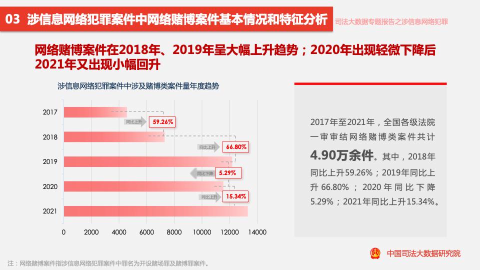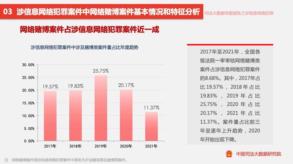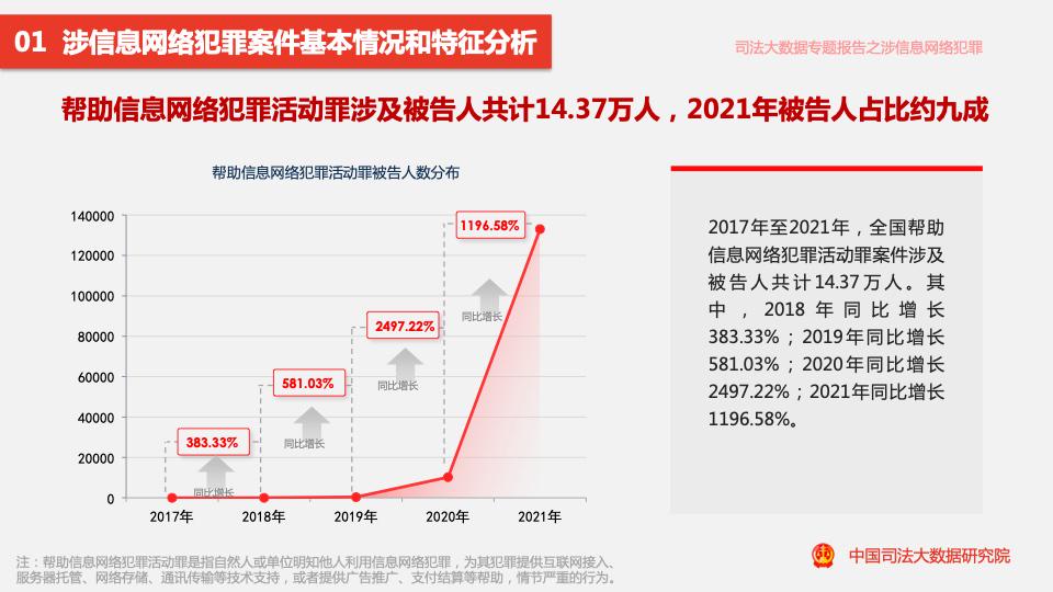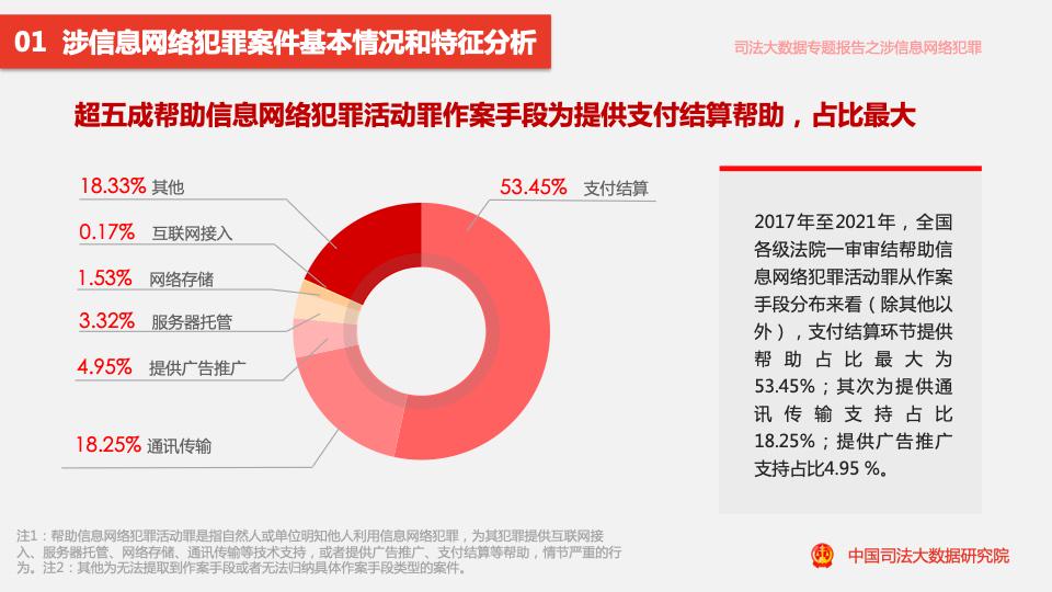報告顯示,2017年至2021年,全國各級法院一審審結的幫助信息網(wǎng)絡(luò )犯罪活動(dòng)罪案件量占涉信息網(wǎng)絡(luò )犯罪案件量的11.88%。