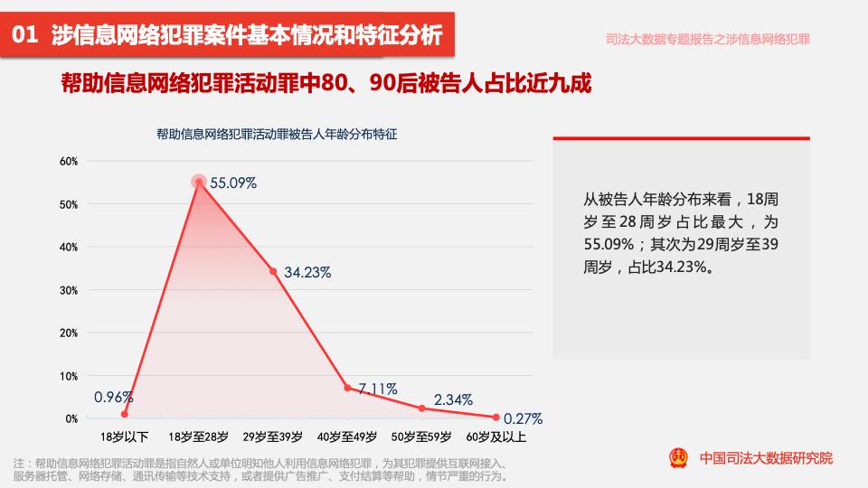 五年來(lái),全國幫助信息網(wǎng)絡(luò )犯罪活動(dòng)罪案件涉及被告人共計14.37萬(wàn)人。從被告人年齡分布來(lái)看,“80后”“90后”被告人占比近九成。其中,18周歲至28周歲人群占比最大,為55.09%;其次為29周歲至39周歲人群,占比34.23%。