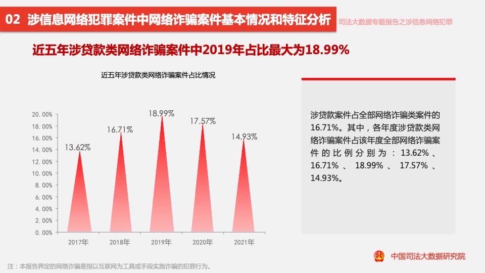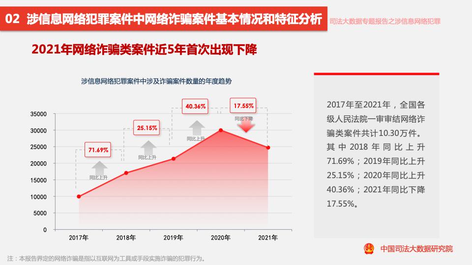 報告顯示,2017至2021年,涉信息網(wǎng)絡(luò )犯罪案件數量呈逐年上升趨勢,近四成案件涉及詐騙罪,2021年網(wǎng)絡(luò )詐騙類(lèi)案件量同比下降17.55%,是近5年來(lái)首次下降。